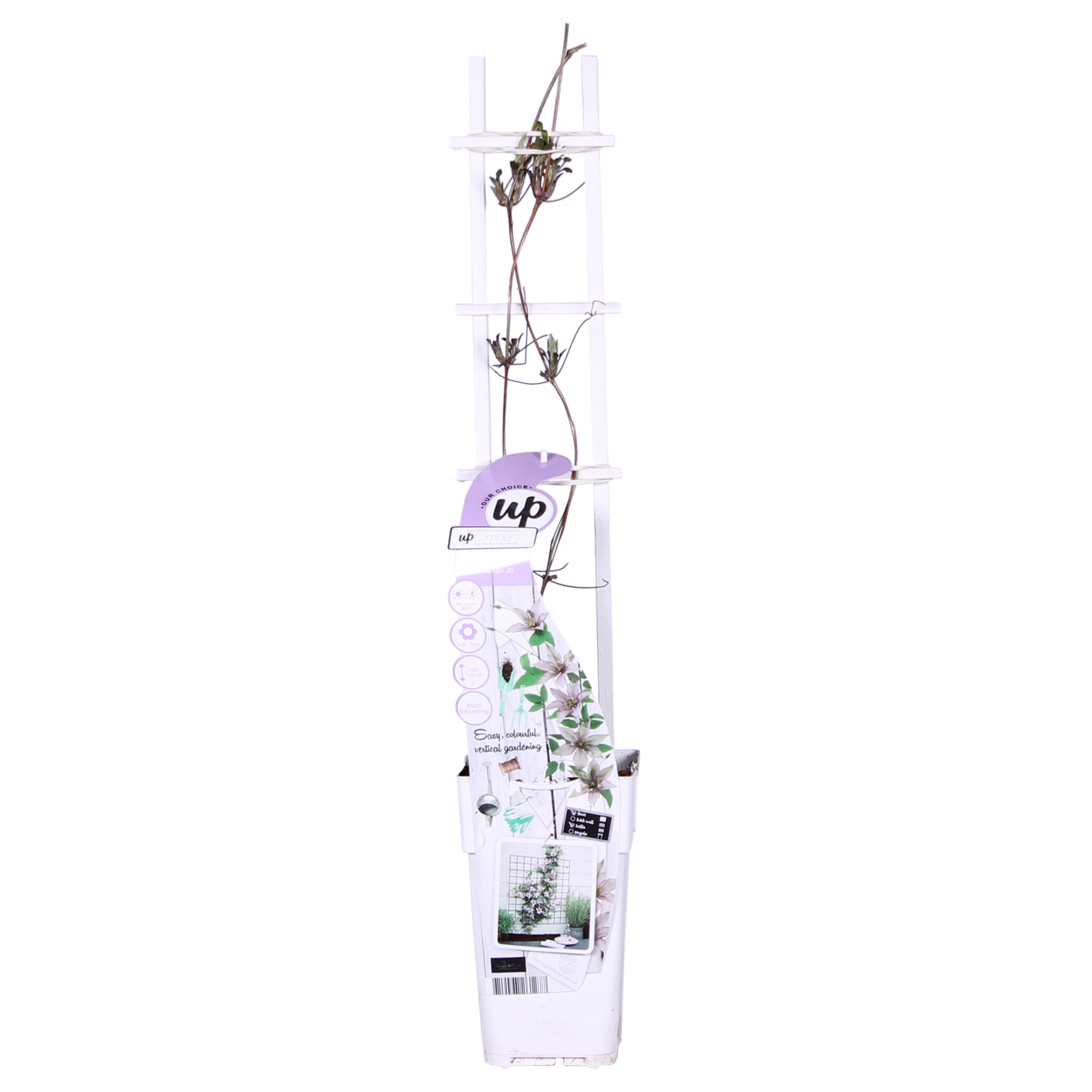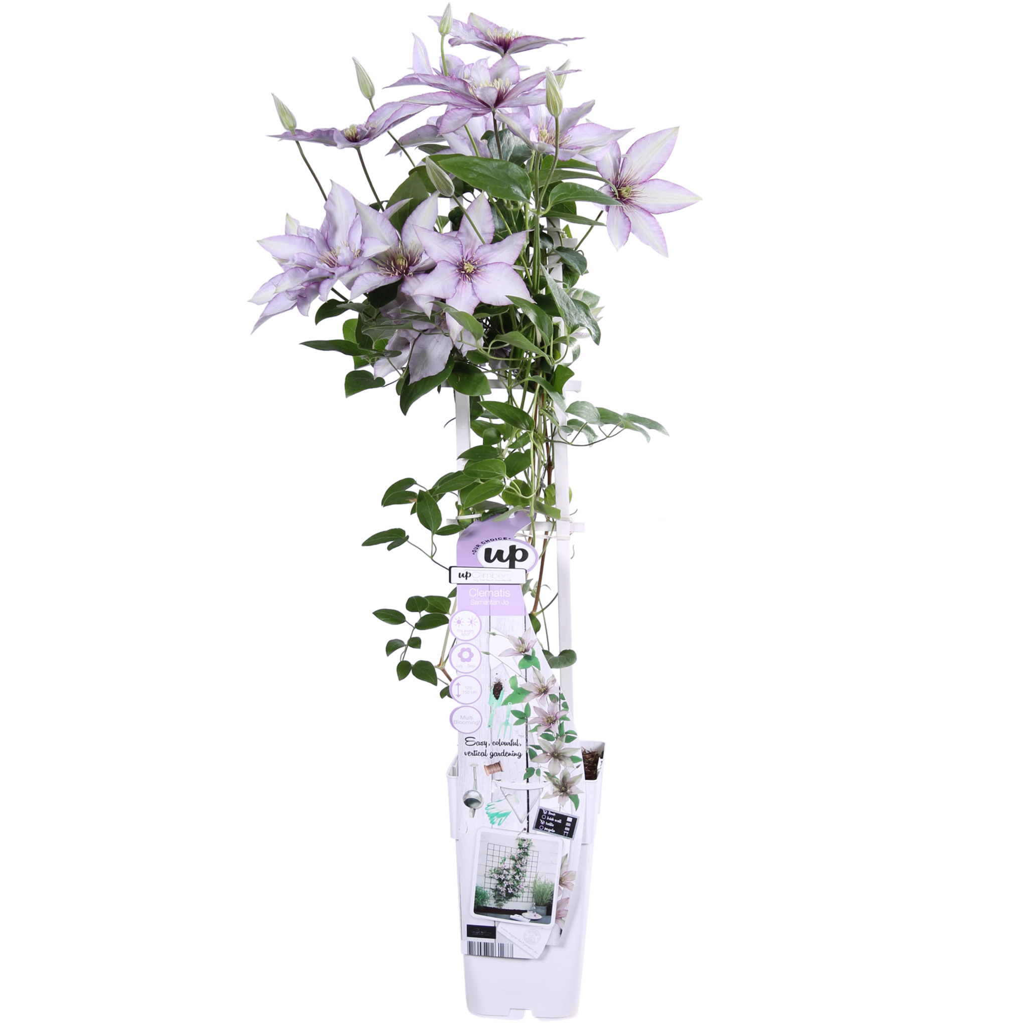 Une clématite très spéciale qui fleurit tout l'été. De mai à septembre, vous pouvez profiter de ses grandes ombelles lilas. Dès la première année, la clématite offre une oasis de fleurs. Contrairement à la plupart des variétés de clématites qui fleurissent pendant 1 à 2 mois, vous pouvez profiter de 'Samaritan Jo' jusqu'à 5 mois. La clématite 'Samaritan Jo' pousse jusqu'à 180 cm de haut contre une pergola ou une structure grimpante. Cette clématite préfère un emplacement en plein soleil ou partiellement ensoleillé. L'emplacement idéal est le soleil du matin et/ou du soir. Comme 'Samaritan Jo' est une variété compacte, elle peut également être placée dans un pot sur un balcon, une terrasse ou même dans un panier suspendu. Pour que la clématite grimpe mieux, elle a besoin d'un peu d'aide. Il est préférable de guider la plante vers le haut le long d'une grille, d'un fil de fer ou d'un bâton. La taille n'est pas nécessaire. Toutefois, éliminez les rameaux morts et abîmés au début du mois de mars. Au printemps, vous pouvez tailler cette clématite à 20 centimètres maximum au-dessus du sol.