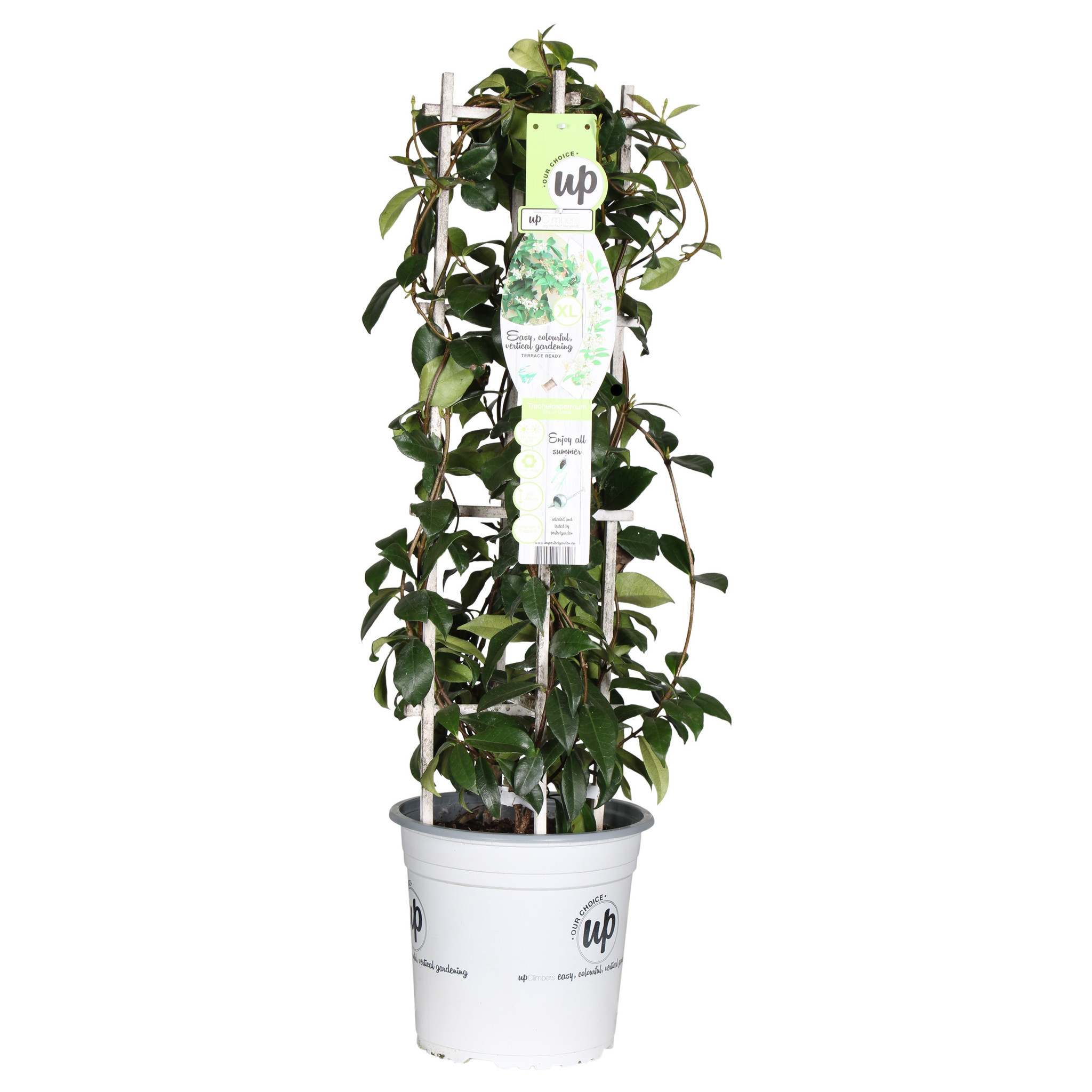 'Trachelospermum Star of Venice' également appelé jasmin étoilé en raison de ses fleurs blanches en forme d'étoile. Il s'agit d'une plante grimpante méditerranéenne à feuillage persistant, résistante jusqu'à -10˚C. La période de floraison abondante s'étend de début juin à fin août, période pendant laquelle les fleurs répandent un agréable parfum sucré. La vigne a des feuilles ovales, vert foncé, et a besoin d'être soutenue par un cadre grimpant ou une clôture pour bien pousser. Les nouvelles branches de ce jasmin étoilé s'enroulent joliment le long d'un treillis ou d'une clôture. L'emplacement idéal est ensoleillé à semi-ombragé et à l'abri du vent. Le jasmin étoilé peut être planté à l'extérieur dans un sol normal riche en nutriments. Le jasmin étoilé pousse également bien dans un pot spacieux sur la terrasse ou le balcon. Dans un endroit ensoleillé, il peut également être utilisé comme couvre-sol. La plante grimpante supporte assez bien les périodes sèches, mais pendant les périodes chaudes et sèches, vous pouvez lui donner un peu plus d'eau. La taille n'est nécessaire que pour donner à la plante la bonne forme. Il est préférable de le faire au début du printemps ou après la période de floraison. Le jasmin étoilé a une croissance assez lente et il lui faudra donc plusieurs années pour atteindre sa taille maximale.