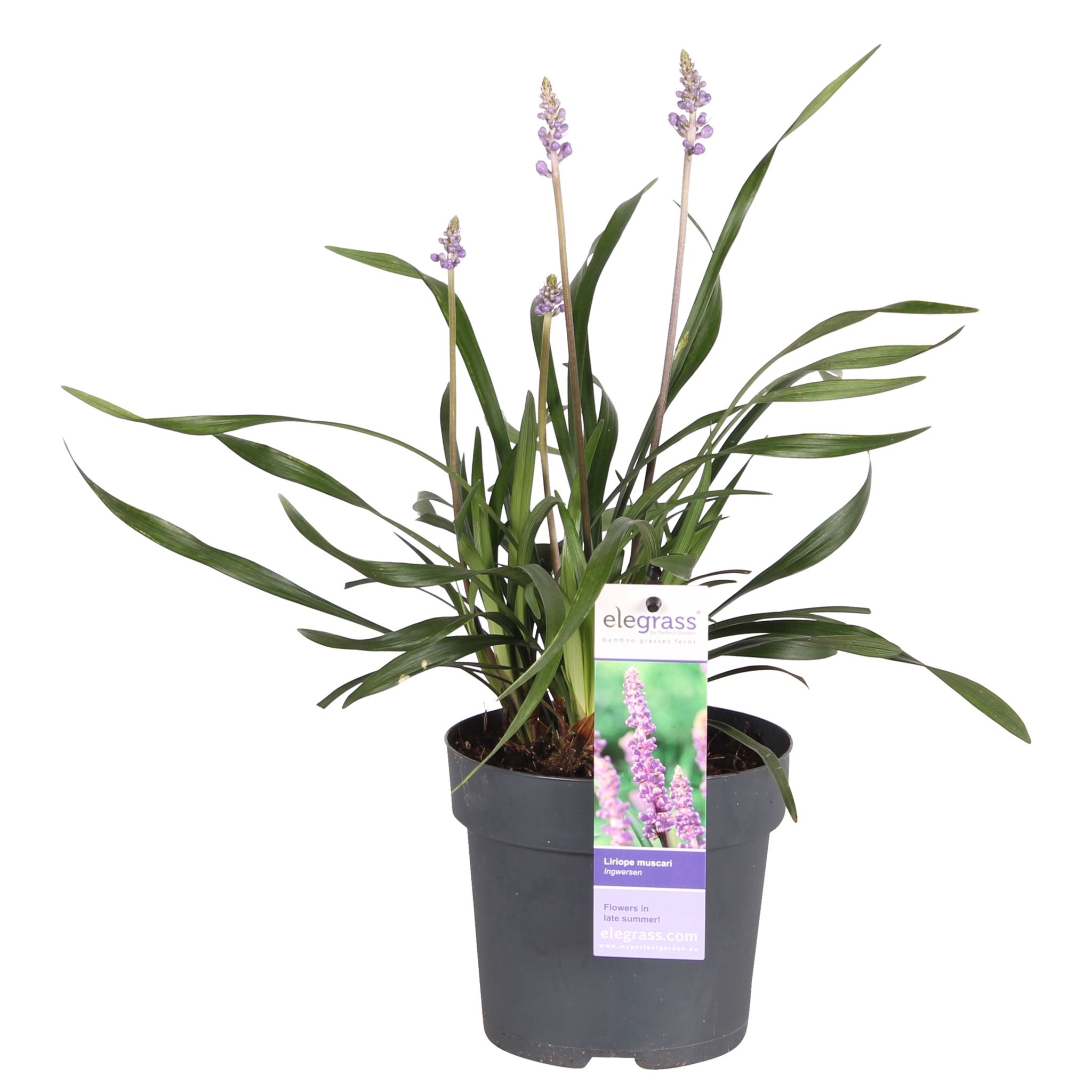 Le 'Liriope Muscari Ingwersen' est l'une des graminées d'ombre les plus populaires en raison de sa floraison remarquable et de sa facilité d'entretien. Il s'agit d'une plante à feuillage persistant dont les feuilles étroites ressemblent à celles d'une graminée. La période de floraison du 'Liriope muscari Ingwersen' s'étend d'août à octobre, période pendant laquelle la plante développe de magnifiques grappes de fleurs pourpres. Le 'Liriope muscari' convient comme couvre-sol, mais vous pouvez aussi le placer dans un joli pot ornemental. Cette plante aime l'ombre et n'a pas besoin d'être taillée. La hauteur de la plante est d'environ 25 à 30 cm.