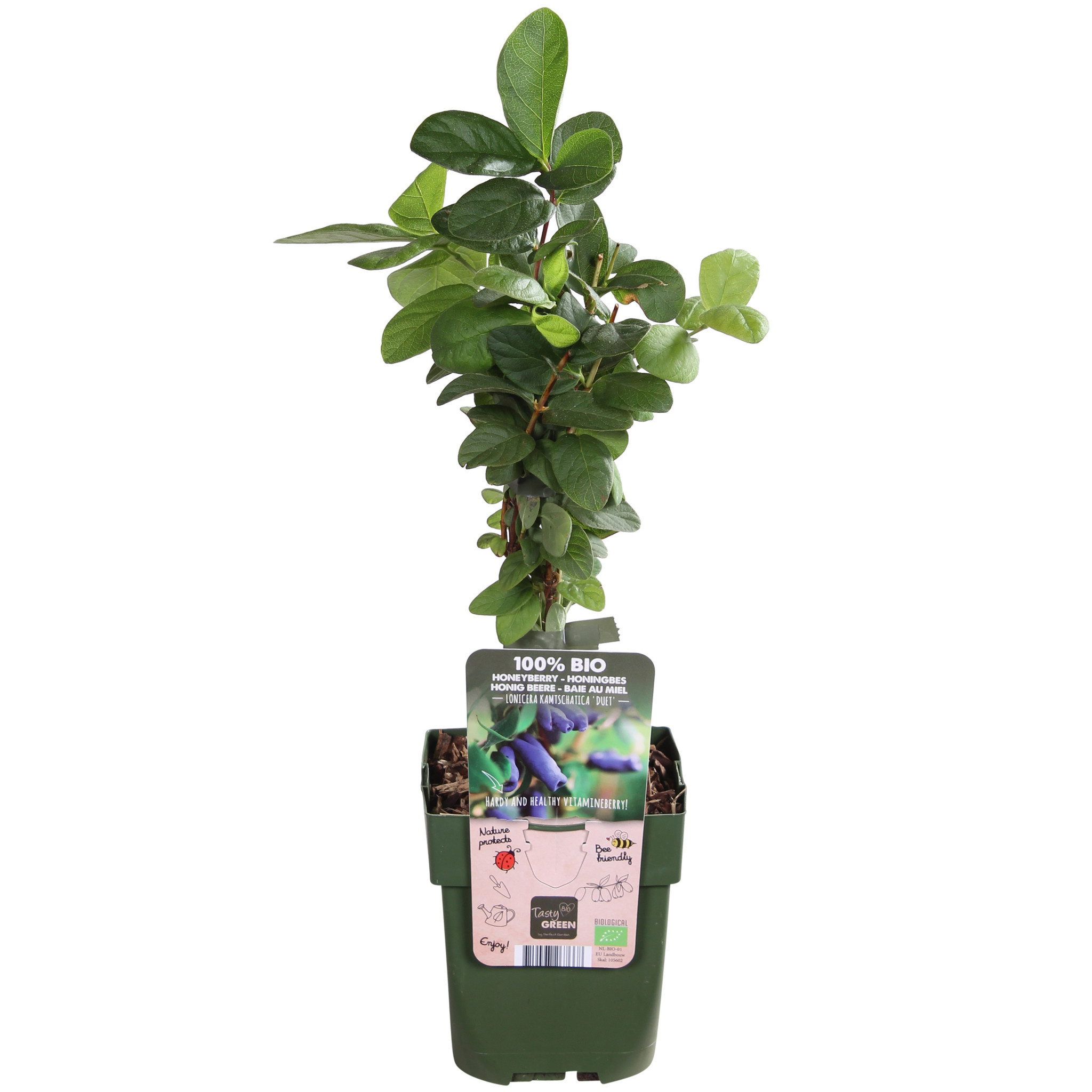Tasty Green, 100% de fruits issus de l'agriculture biologique. Cela signifie que seules des matières végétales et animales ont été utilisées pendant la culture. Le pot et l'étiquette sont en plastique recyclé et constituent donc une solution propre pour l'environnement. Lonicera Kamtschatica Duet" est un chèvrefeuille bleu dont la saveur est similaire à celle de la myrtille. Il est originaire du nord-est de l'Asie et de la Sibérie et est encore relativement peu connu aux Pays-Bas. L'arbuste est très résistant et fleurit avec des fleurs vert-jaune discrètes. L'alisier est autofécondant, mais lorsque plusieurs plants sont plantés ensemble, la récolte est plus abondante. Les bourdons se chargent de la pollinisation. Les fruits apparaissent plus tard que ceux de 'Lonicera Kamtschatica', vers août/septembre. Les baies sont de couleur bleu foncé, sont un peu plus grandes que la moyenne et ont une forme allongée particulière.